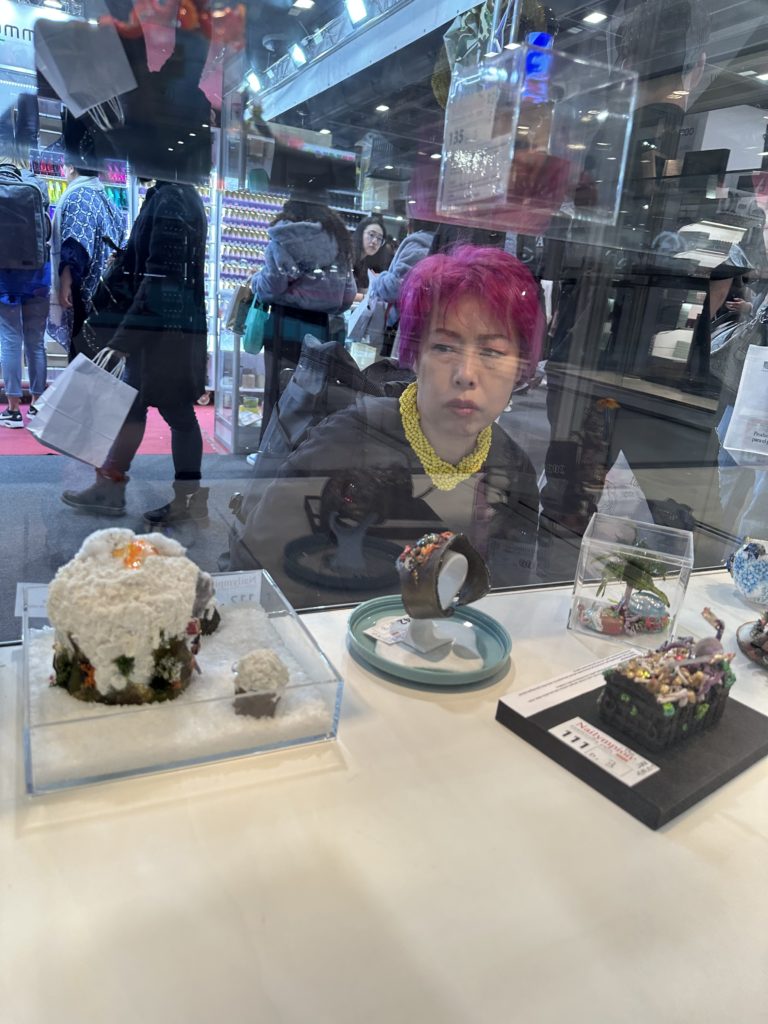 ネイリンピオン スペイン2025・ショーケースの中に並ぶネイルアート作品を見つめるみどりさん・・・